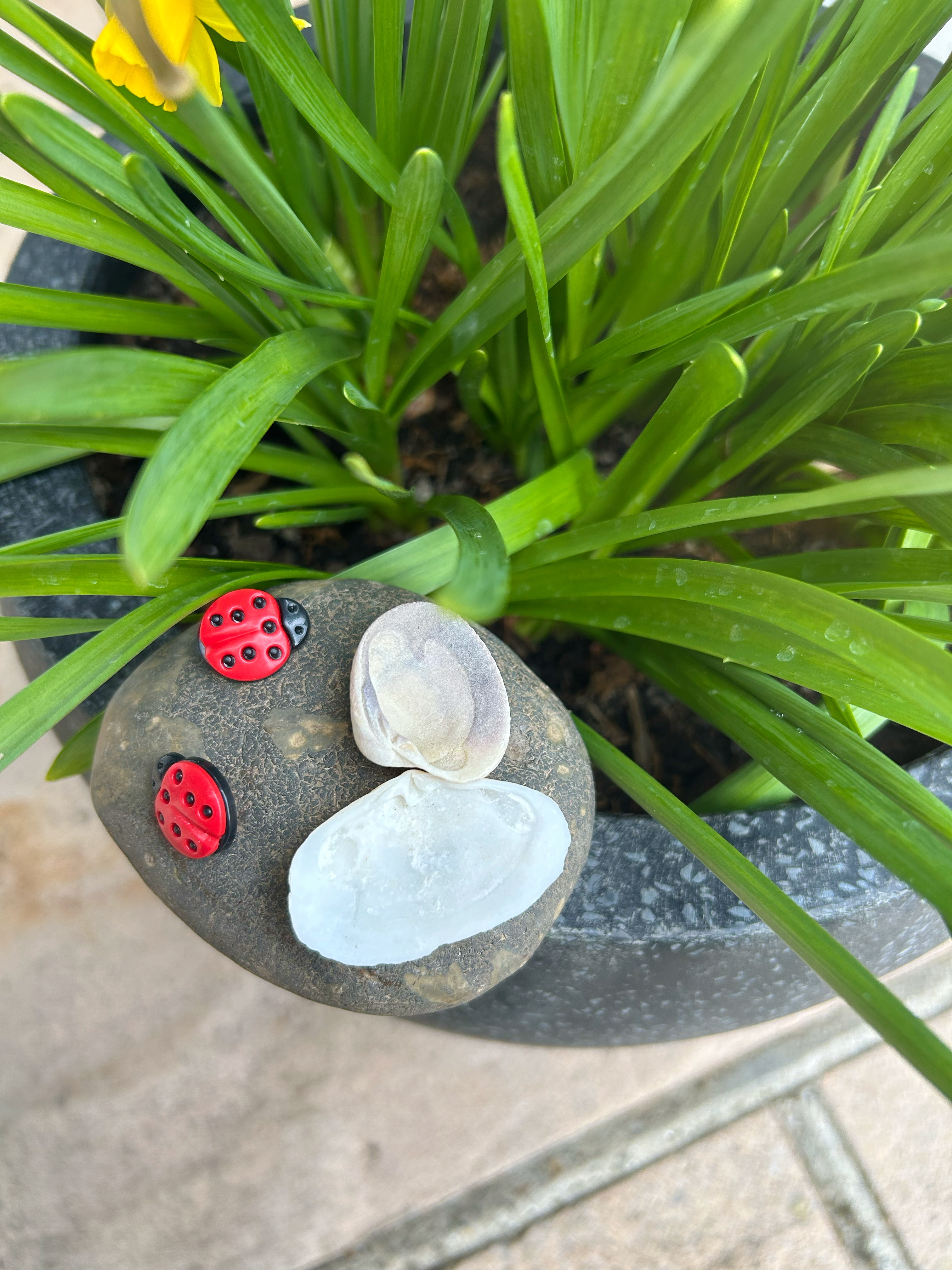 Recently I made a bee water cup from a couple of ladybird buttons, a stone and some shells I picked up on a beautiful island just off the coast of New Zealand. I glued everything to the stone and filled the shells with water, and placed it next to the daffodils in my garden.