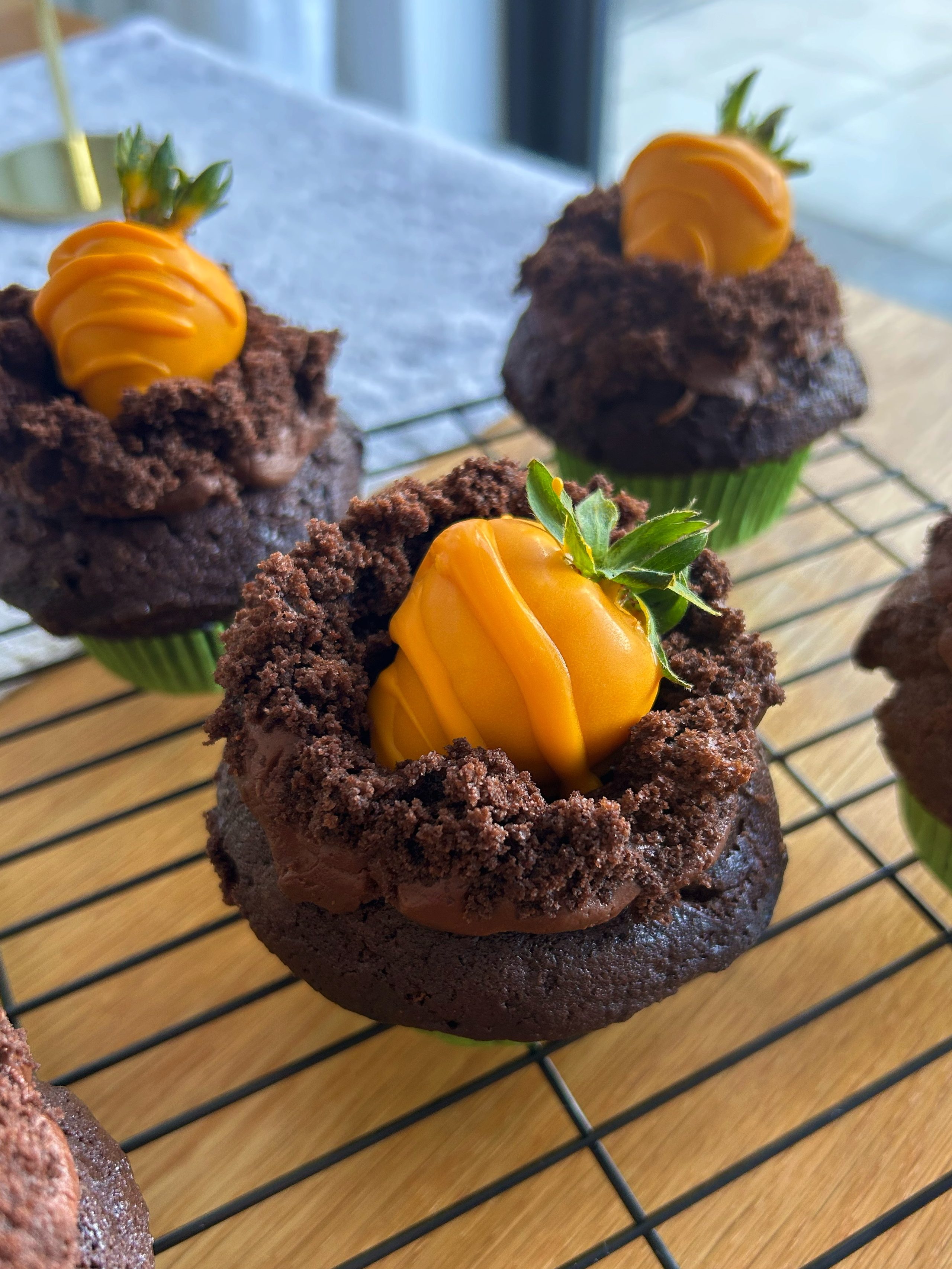 I needed a dessert for my spring dinner party, so it was the perfect opportunity to bake these carrot patch cupcakes. They’re designed to look like fresh carrots dug out of the ground. I used green cupcake liners to act as grass, and crumbled-up pieces of cupcake for dirt.