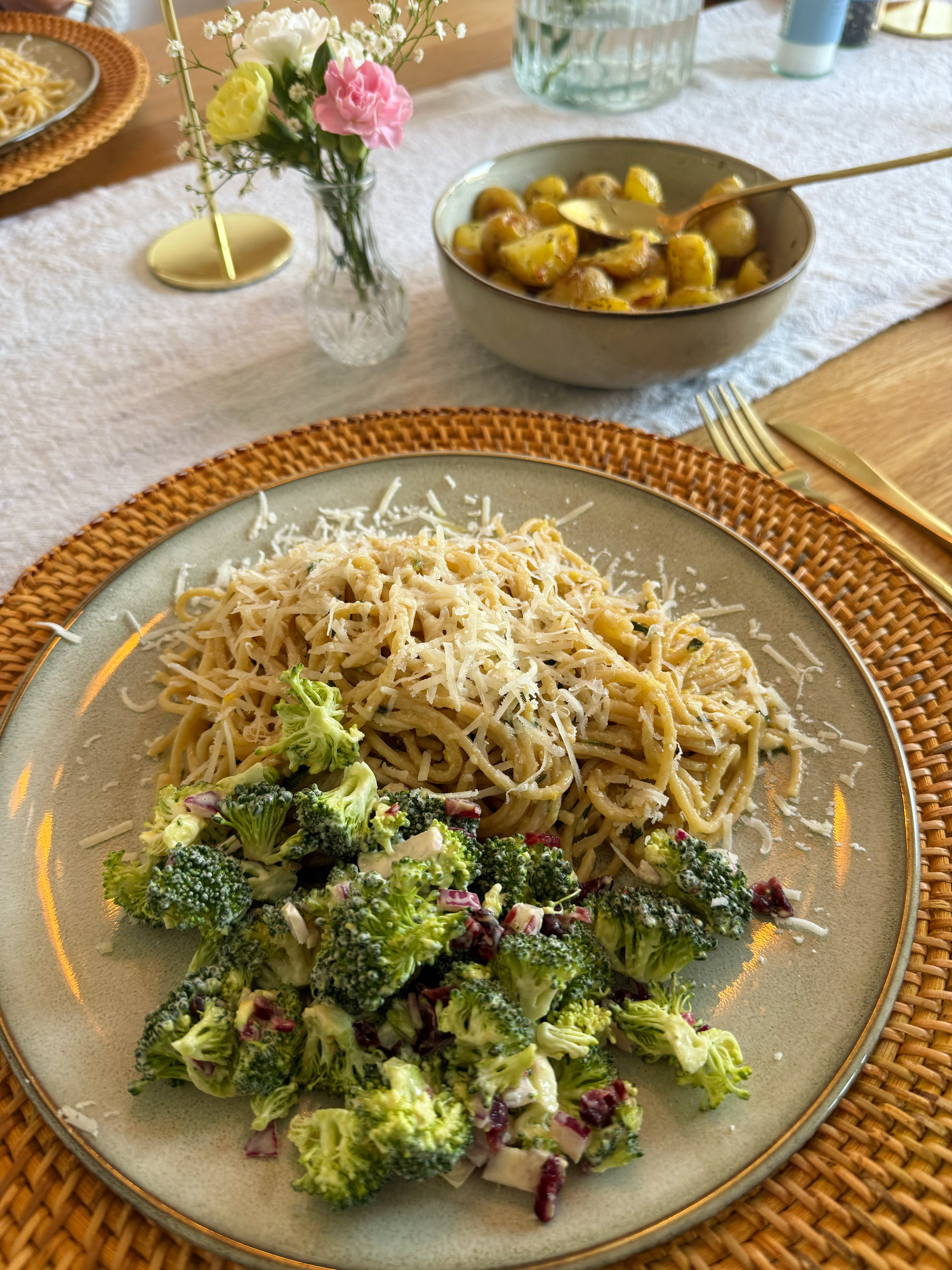 On the menu was Alright With Me’s lemon-parmesan pasta, with broccoli salad and rosemary new potatoes on the side. I love those fresh, citrusy flavours that just scream spring.