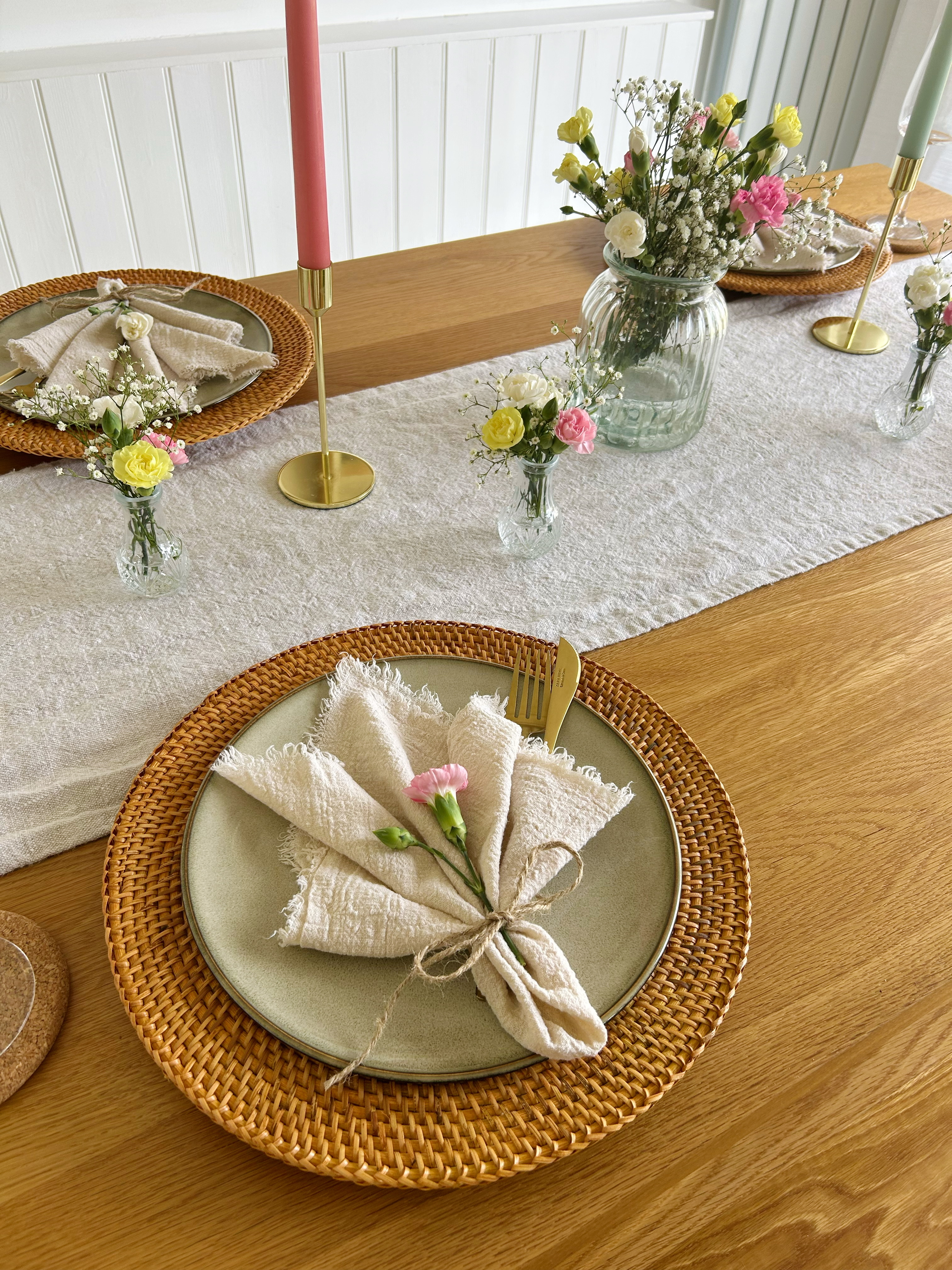 It was the perfect opportunity to try out a new napkin-folding technique, which was a great success. Everyone agreed they were too pretty to use! The little bud vases are from Søstrene Grene, along with the tapered candles.